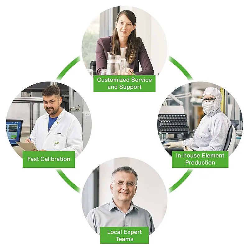 E+E 传感器在公司自有的 EN ISO/IEC 17025 认证实验室中校准,校准结果可追溯至国家计量机构(BEV/E+E)。这为 GMP 和 FDA 监管环境提供充分的文档保障和审计准备。Omniport 40 等便携式校准设备可用于现场快速验证。