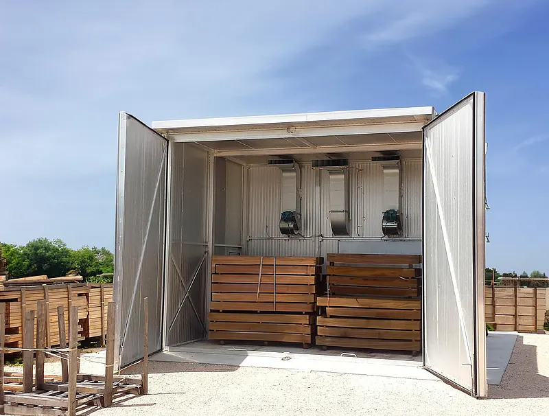 堆垛干燥是窑干的补充方案,具有灵活并且经济实惠的优点。在此过程中,将木材分层均匀堆叠(称为“堆垛”),在受控的环境条件下实行缓速干燥。此方法需要准确监控温度、湿度和气流等,特别适用于中小批量木材的干燥作业。
