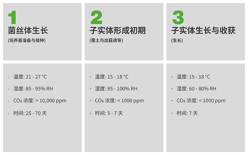 在室内环境中保障菌菇的生长,意味着需要尽可能准确地营造自然生长的条件。因此,菌菇生长过程的不同阶段决定了菌菇培养的温度、湿度和 CO₂ 浓度的环境控制要求——包含了从基质制备到采收整个环节。