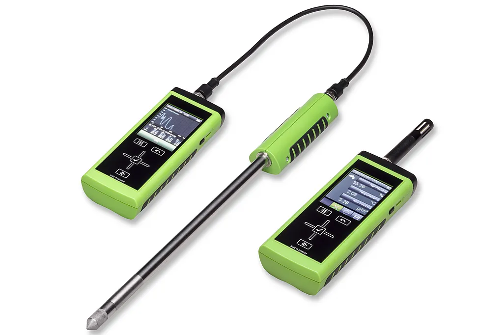 A wide range of applications is offered by the multi-functional handheld unit Omniport 30. With various interchangeable sensing probes, up to 22 measurements can be recorded, such as relative humidity, temperature, air velocity and CO₂ and the data stored via the data logger function. Operation is simple and intuitive via the large touchscreen display.