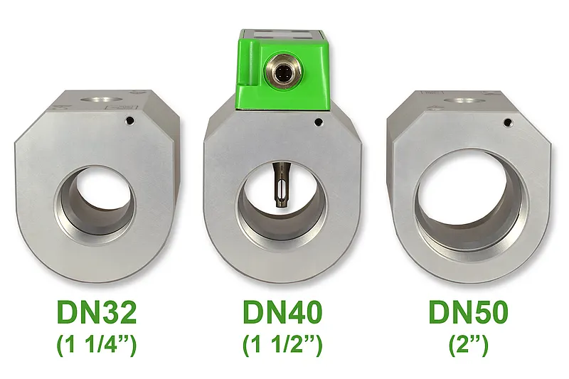 The modular EE741 consists of the transmitter unit with flow sensor and a stainless steel or aluminum gauge mounting block. The mounting blocks are available for DN15 (1/2”), DN20 (3/4”), DN25 (1”) and now also for DN32 (1 1/4”), DN40 (1 1/2”), DN50 (2”) pipes.