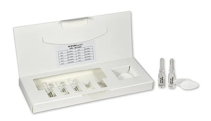 E+E标准湿度溶液为不饱和盐溶液,每一套标准溶液含有5瓶或50瓶密封的安瓶溶液,可存储很长时间。盐溶液无毒,使用时无需采取特殊的安全措施。如有需要,我们可提供安全数据表。E+E的每一套湿度校准设备都提供可溯源的由奥地利国家计量学会(NMI)颁发的校准认证证书。