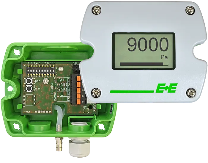 EE600 可以选择满量程 1000 Pa 或 10000 Pa 进行测量,测量精度高达 ± 0.5 % FS。 对于模拟输出版本,EE600 的量程选择可以通过拨码开关来设置。 E600 采用了压敏电阻式敏感元件,保证了变送器优越的长期稳定性。
